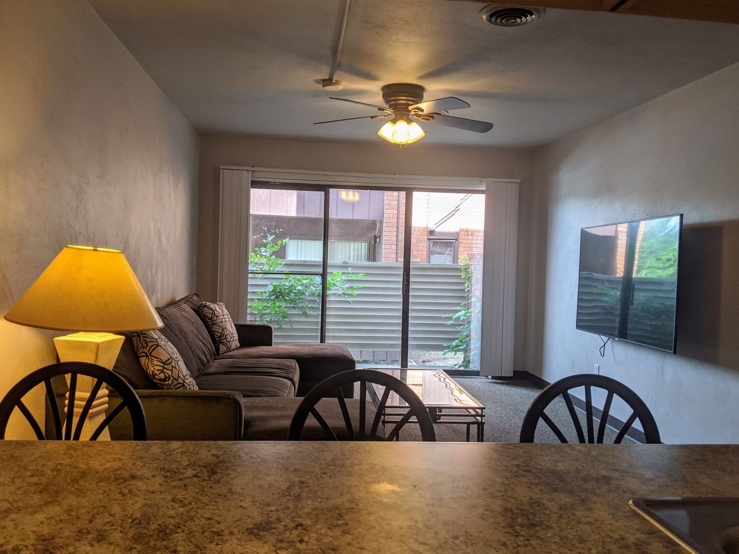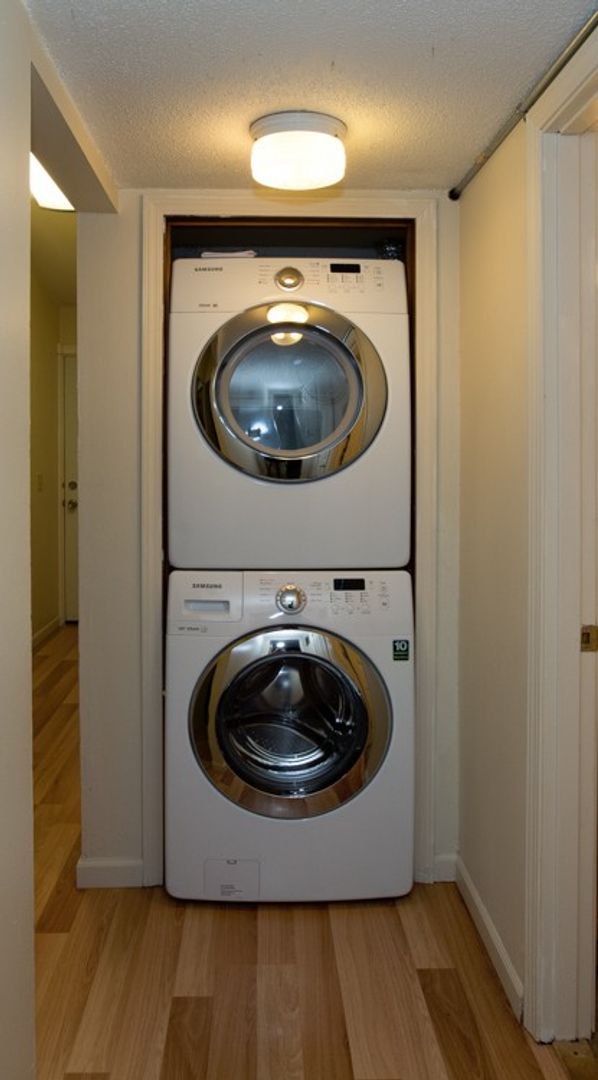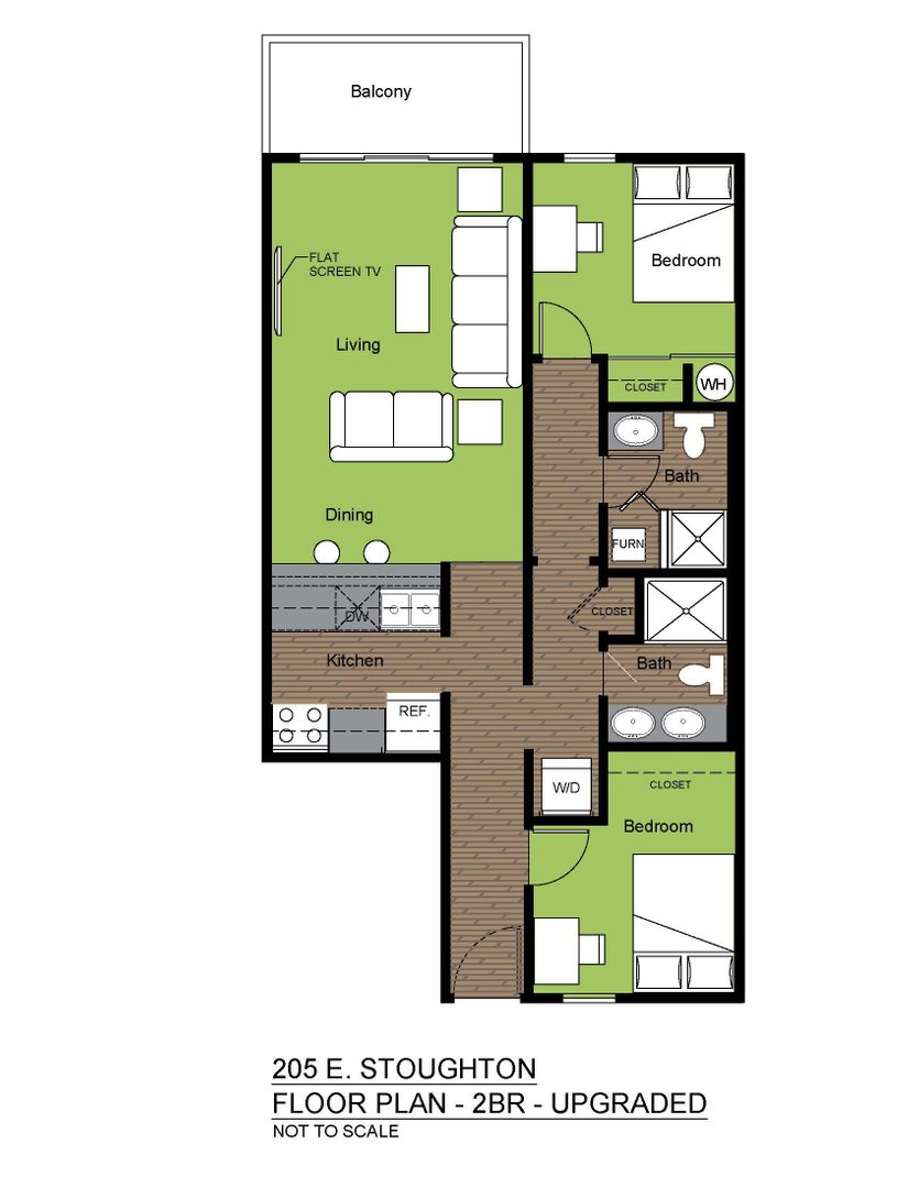 These fully furnished 2-bedroom, 2-bath apartments are near County Market and the Engineering Quad, with Scott Park just across Springfield Ave. Units include in-unit laundry, track lighting in the bedrooms, a 65" Smart TV, and access to a secure bike room.