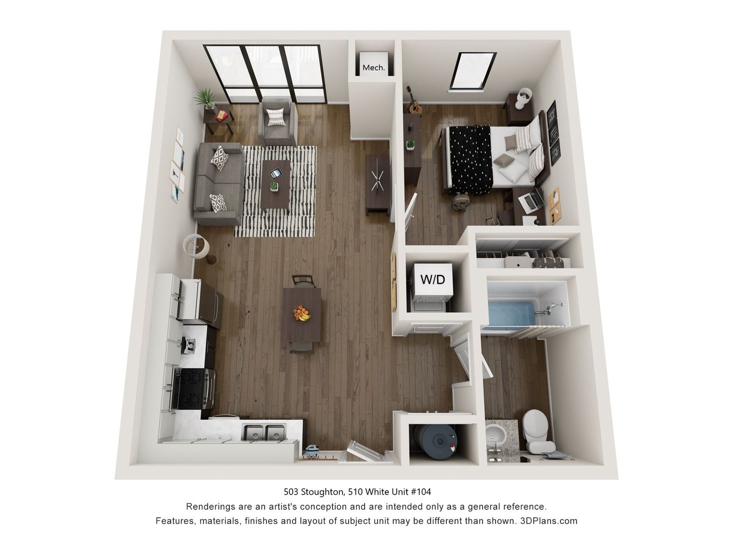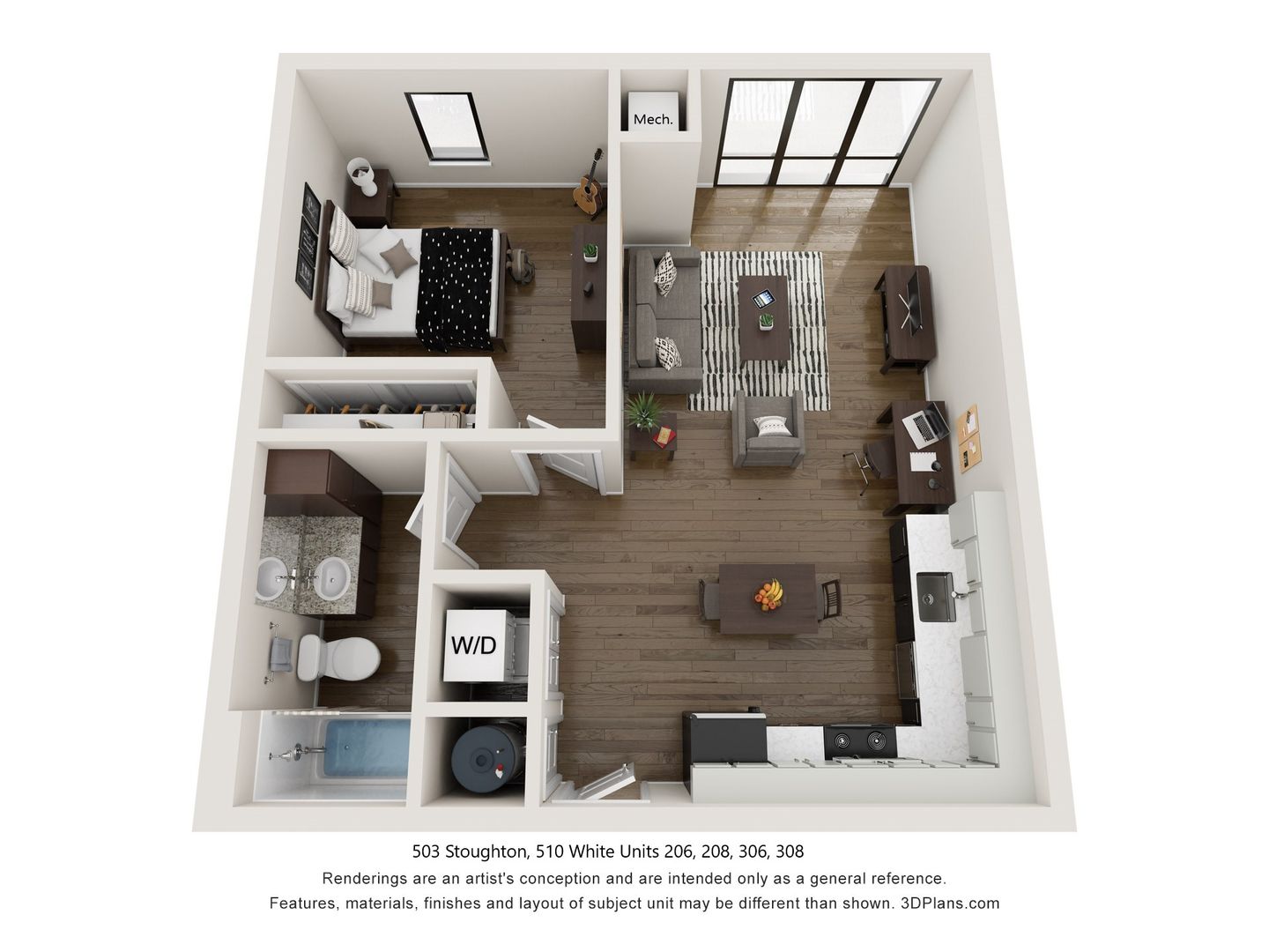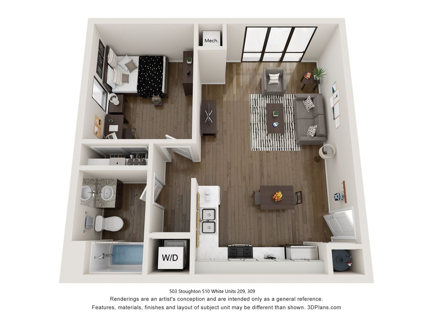 These new 1-bedroom apartments feature granite countertops, a dishwasher, plank flooring, a smart TV, and in-unit laundry. Located just blocks from County Market and near the University of Illinois Engineering Quad, in an eco-friendly building with high-efficiency materials and rooftop solar panels.