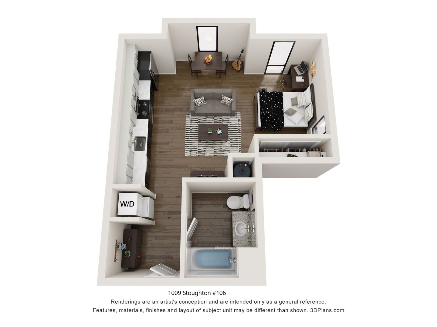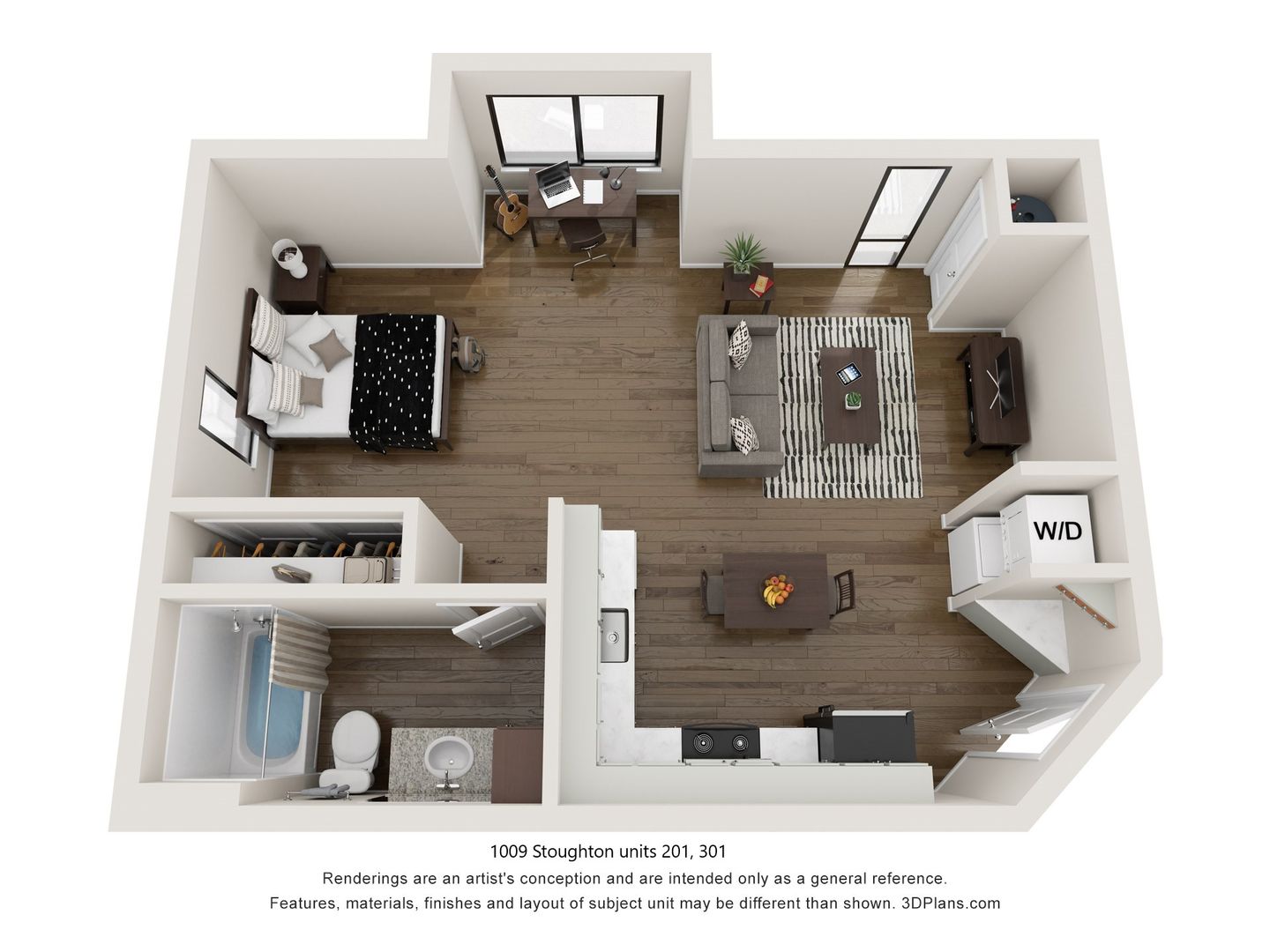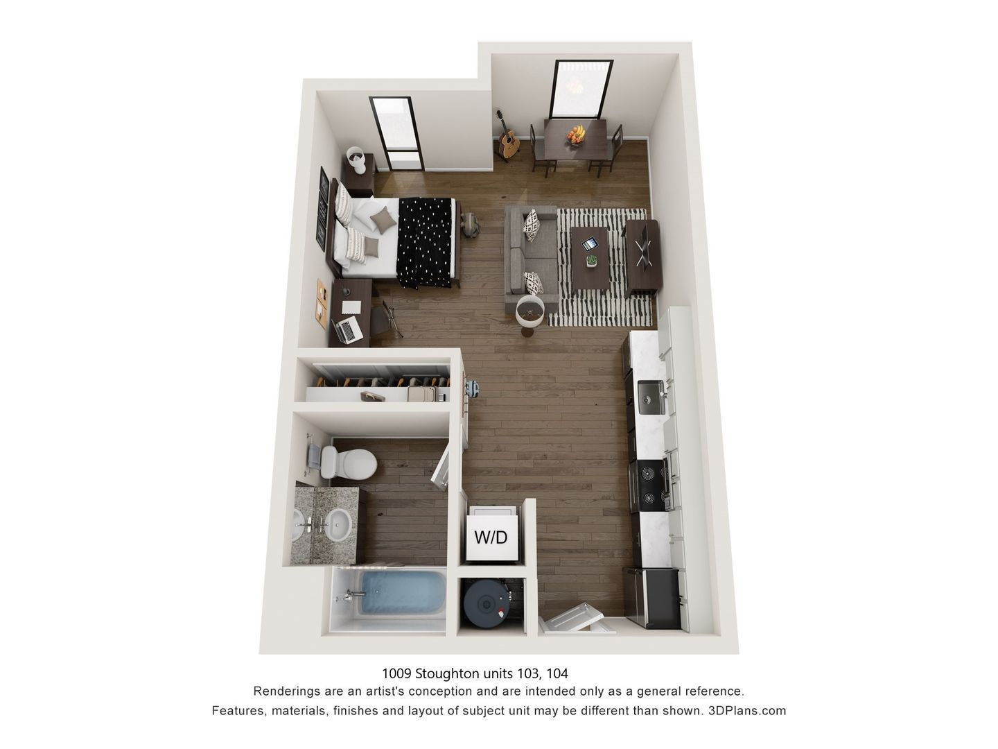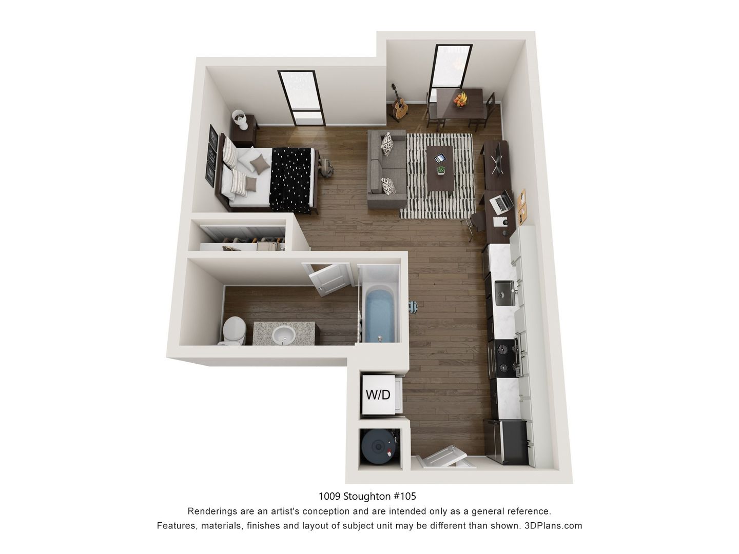 1009 W Stoughton offers new studio apartments with granite countertops, plank flooring, in-unit washer/dryer, dishwasher, and a smart TV. The building is eco-friendly with high-efficiency materials and rooftop solar panels.