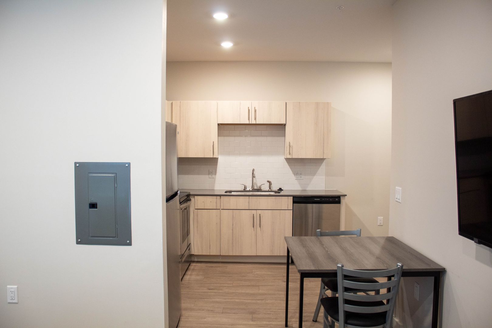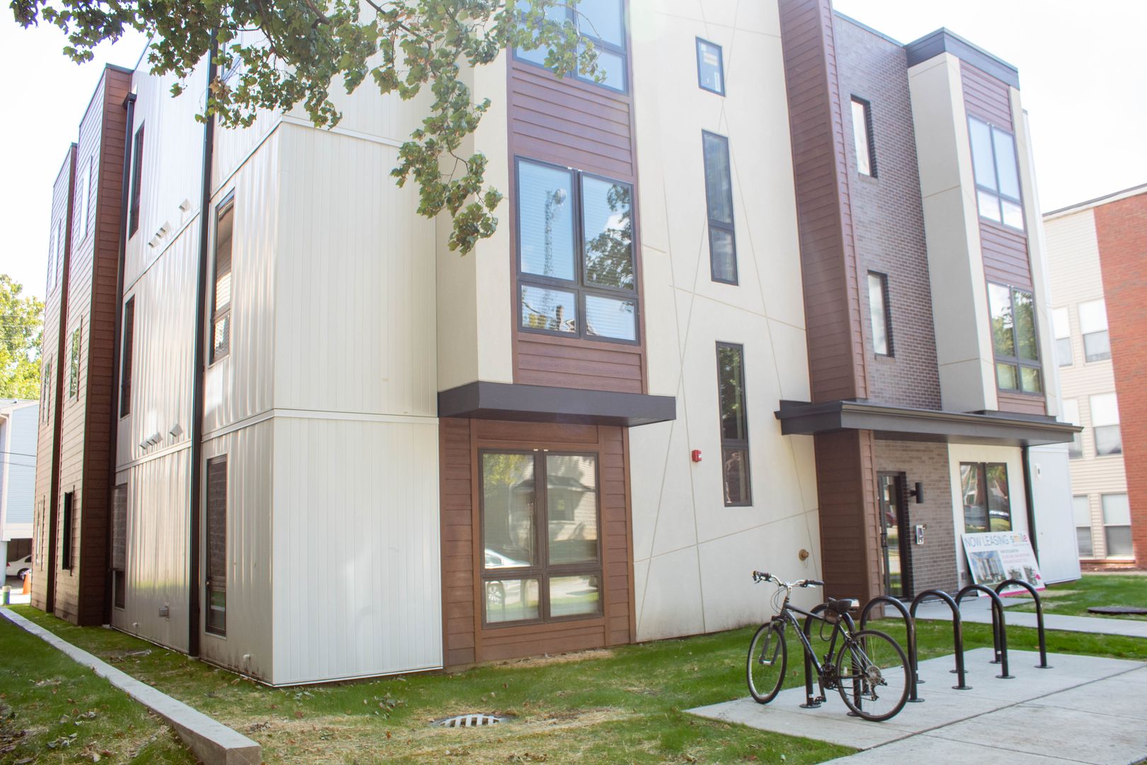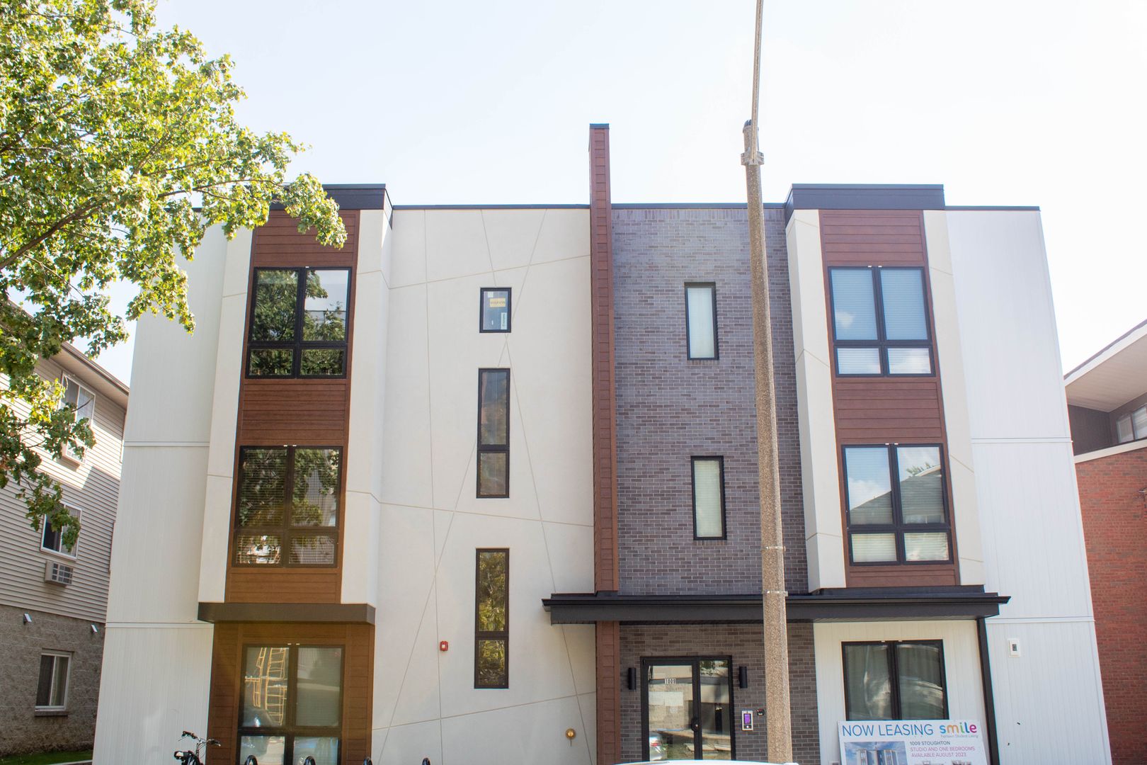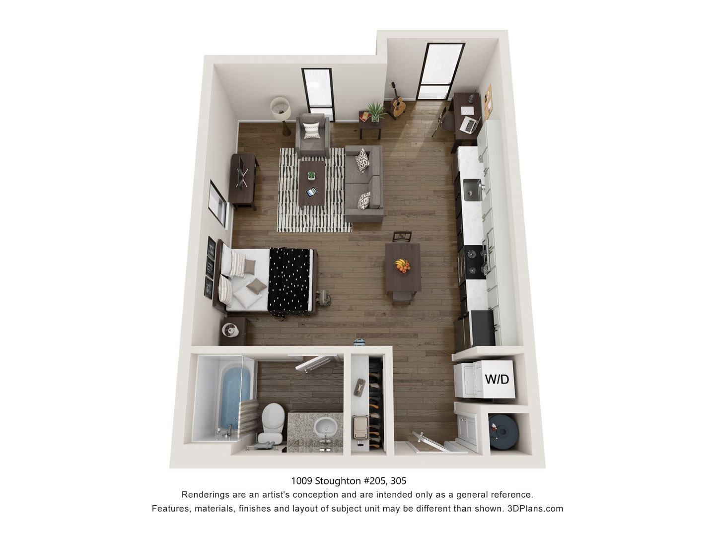 1009 W Stoughton offers new studio apartments with granite countertops, plank flooring, in-unit washer/dryer, dishwasher, and a smart TV. The building is eco-friendly with high-efficiency materials and rooftop solar panels.