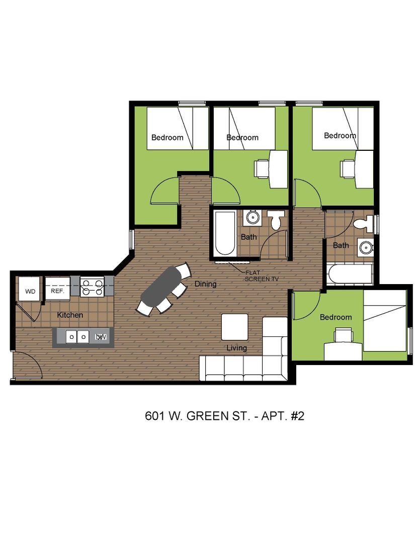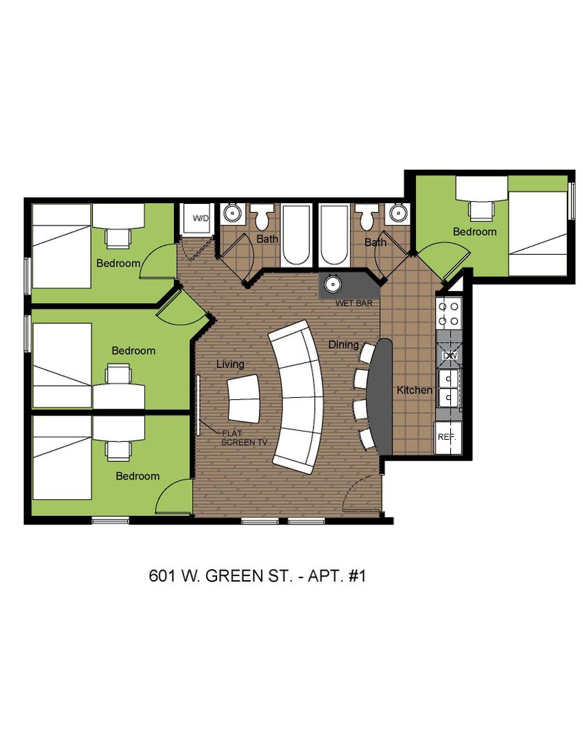 601 Green is located in a quiet neighborhood just blocks from the University of Illinois campus and Downtown Urbana. With bus stops steps away, you’ll have convenient access to transportation. This spacious apartment features high ceilings, two full baths, a large living and dining area, a built-in wet bar with a beverage chiller, a flat-screen TV, and in-unit laundry.