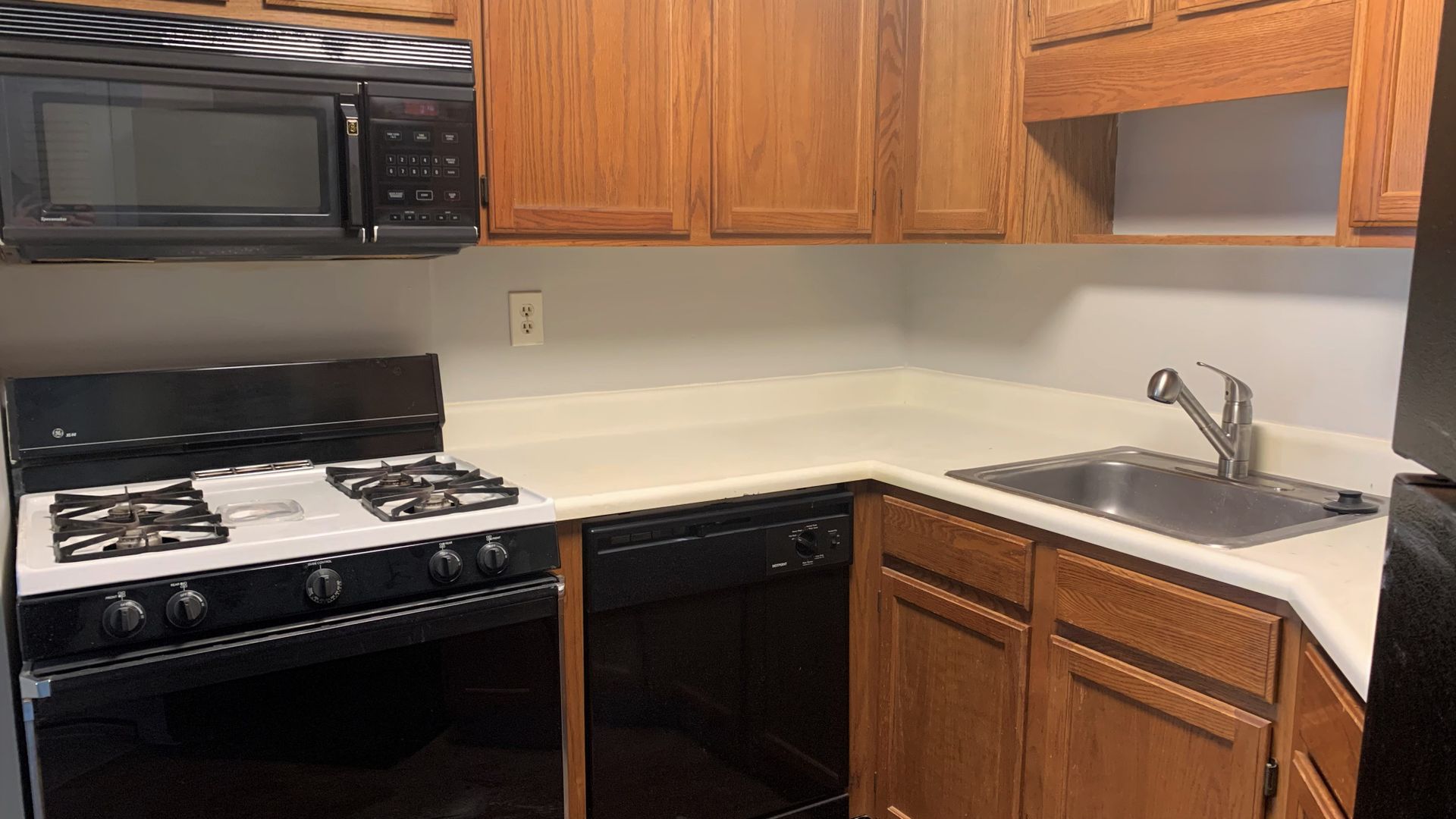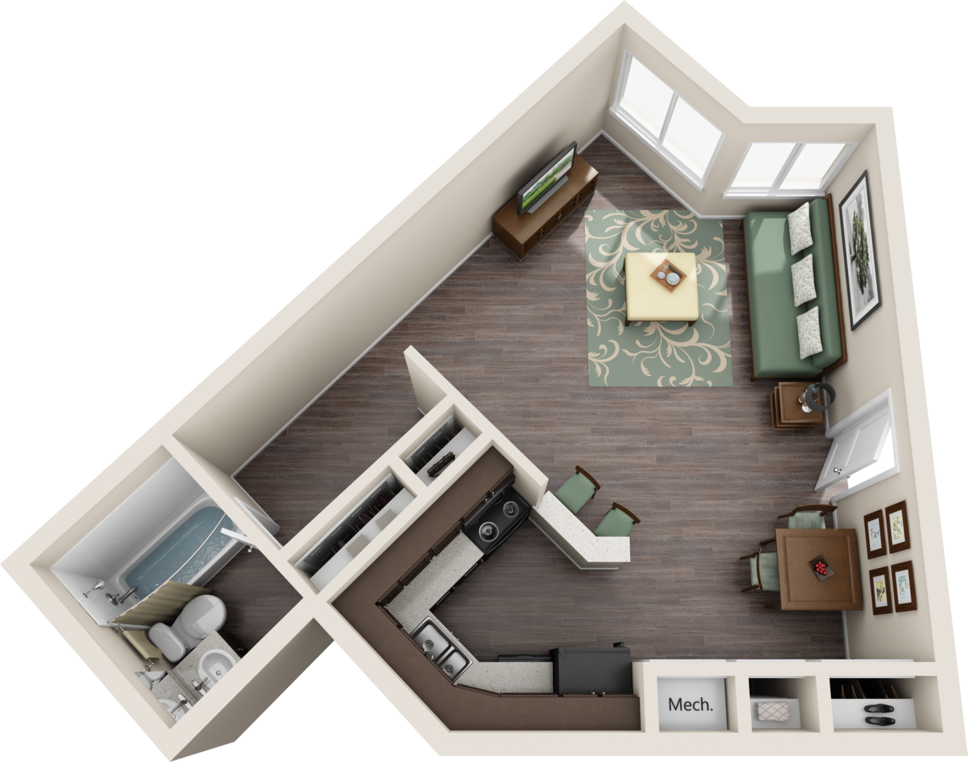 These unique studio apartments feature a corner layout that offers a more secluded kitchen area and closet space. Kitchens are fully furnished with a full-size stove, refrigerator, dishwasher, and plenty of counters and cabinet space.