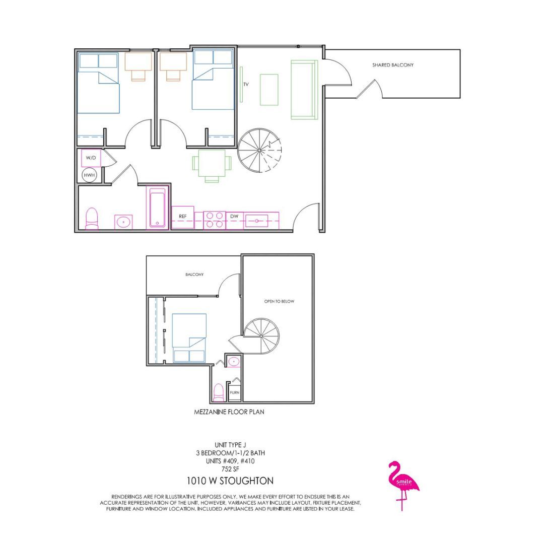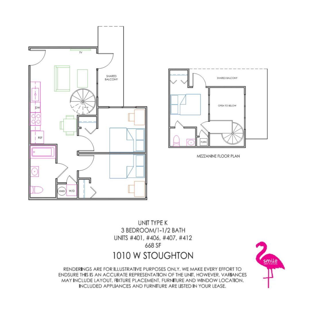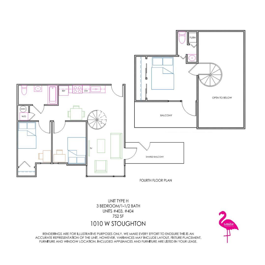 These upgraded lofted 3-bedroom, 1.5-bath apartments are just a few blocks from the UIUC Engineering campus in one of the greenest campus neighborhoods. Most units include access to a shared balcony, with dining options nearby on University Ave and Green St. All units feature in-unit laundry and a dishwasher.