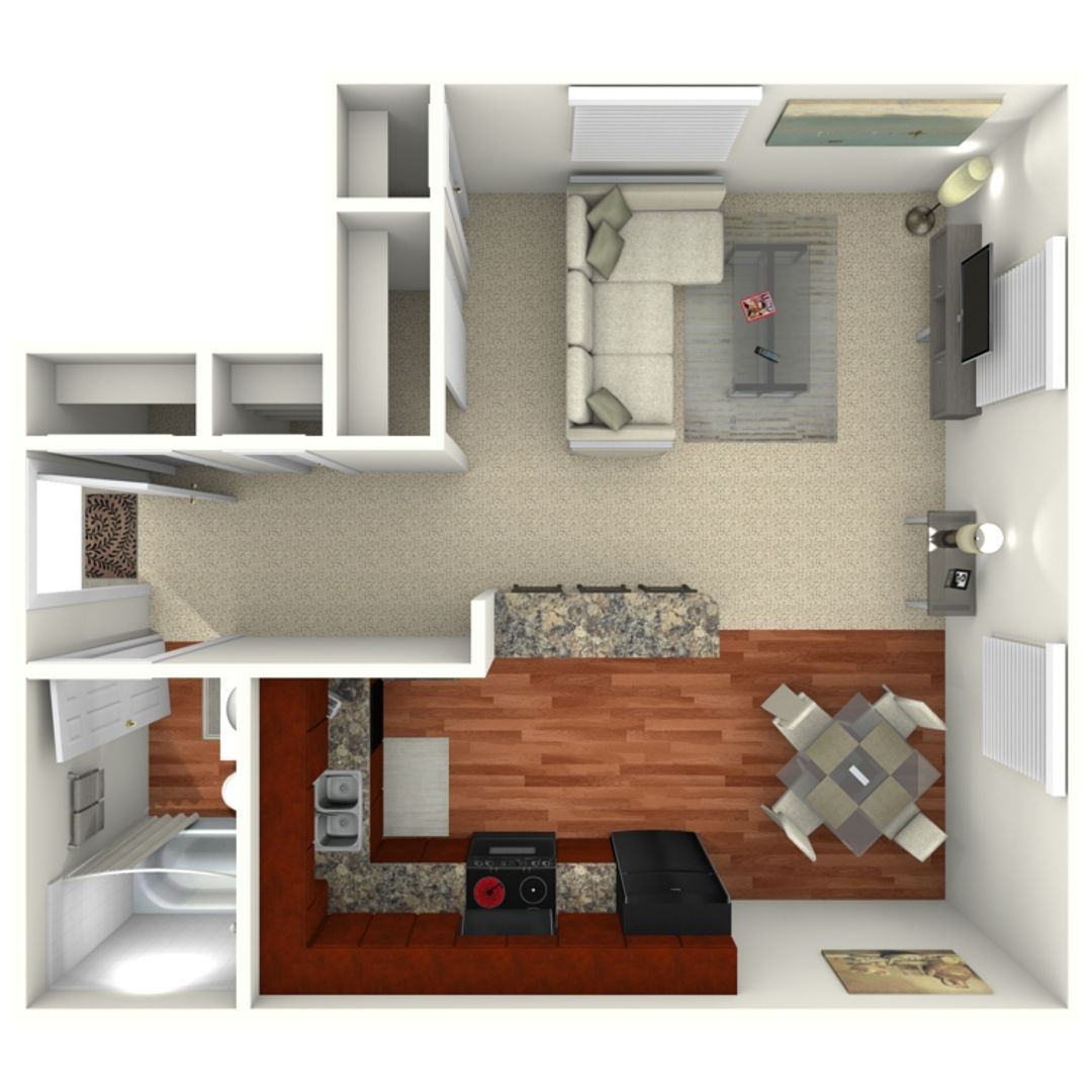 The spacious studio apartment includes an eat-in kitchen with a stove, dishwasher, and fridge. Residents can enjoy our pool with sundeck, clubhouse, picnic area with grills, playground, and bark park. There is on-site parking available.