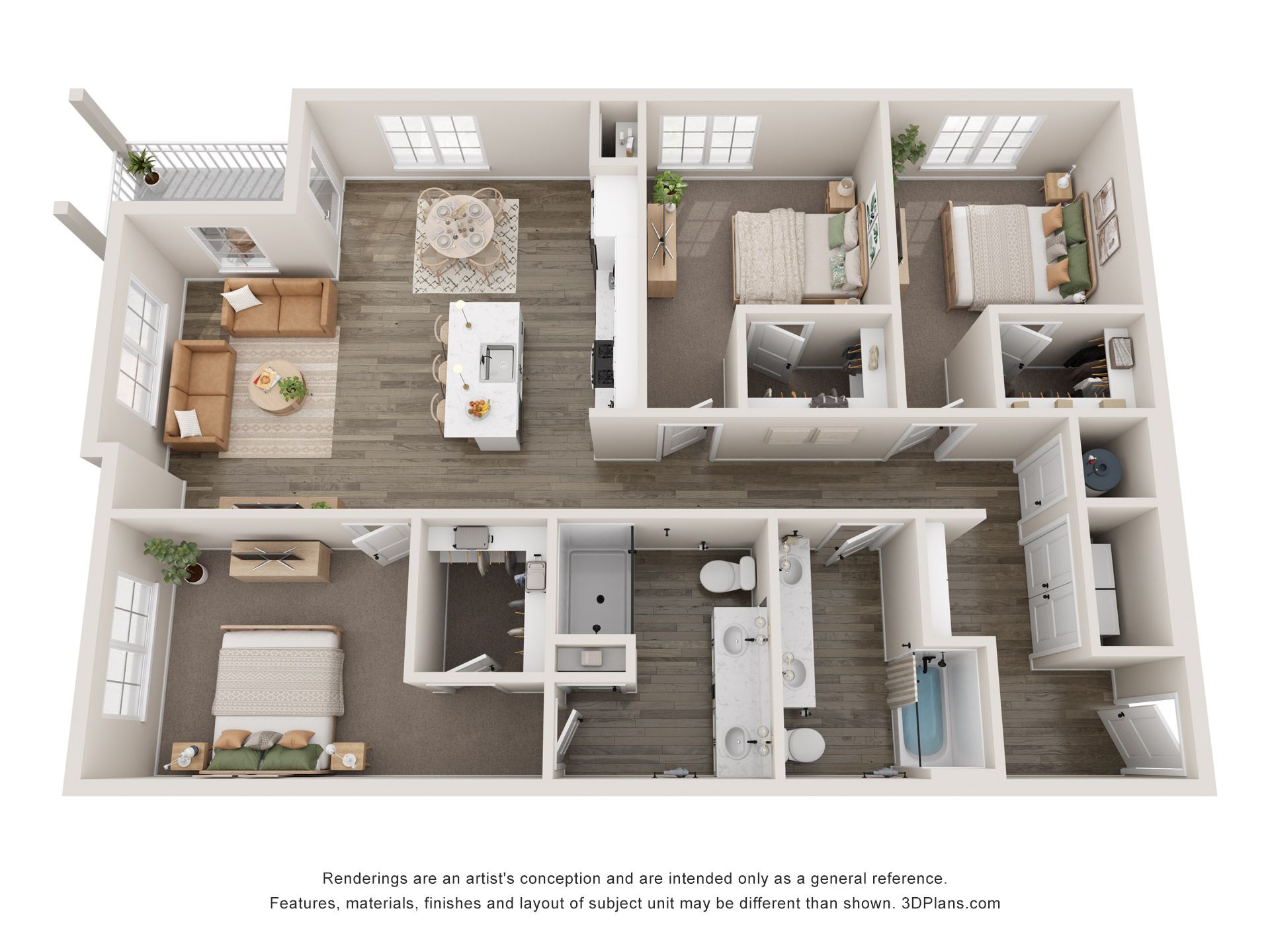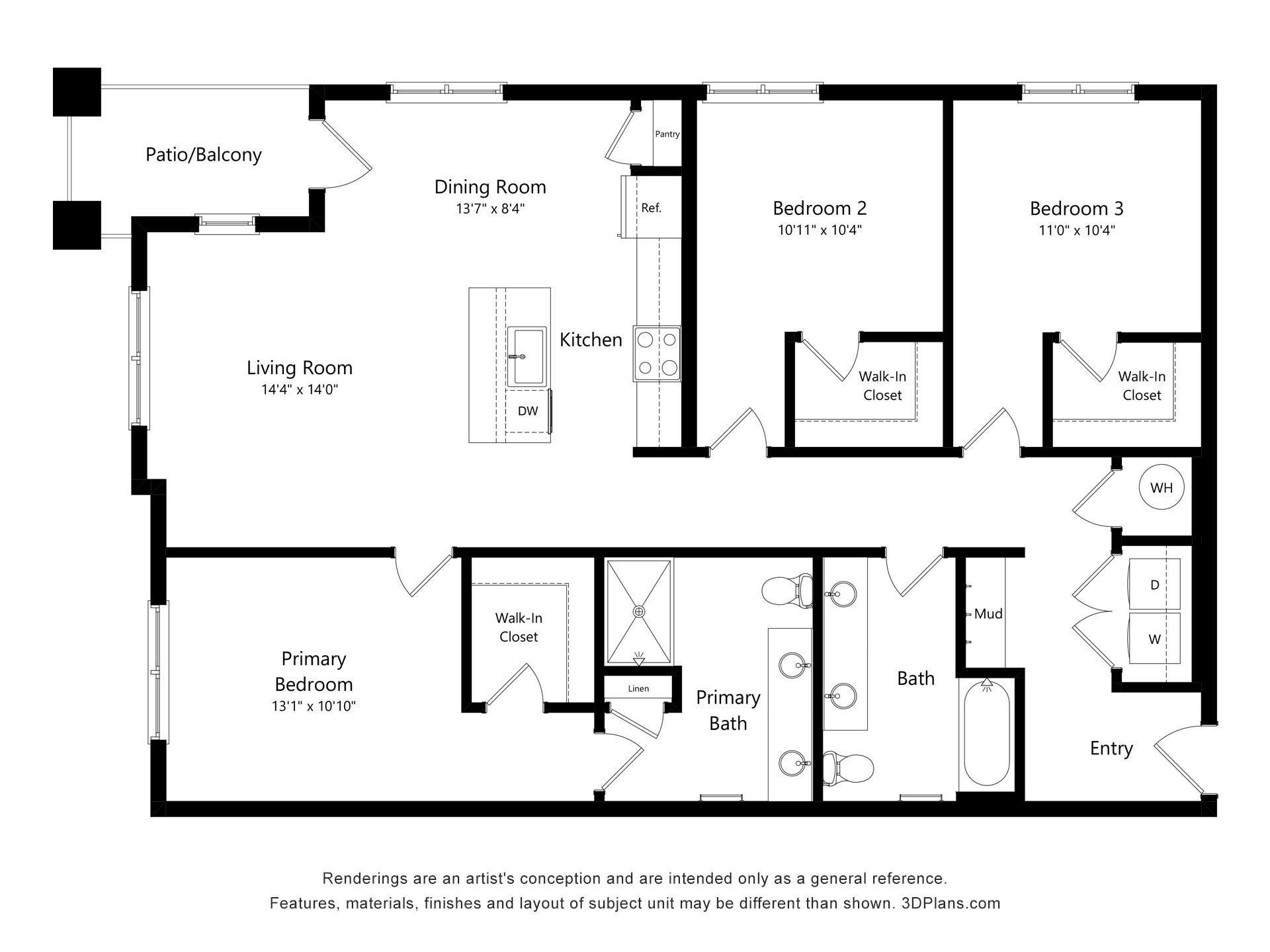 This three-bedroom, two-bathroom floor plan offers 1,480 sq. ft. of well-designed living space. Highlights include a walk-in closet, a private ensuite bathroom, and the convenience of in-unit laundry. The eat-in kitchen comes fully equipped with a stove, dishwasher, refrigerator, and microwave, making meal prep a breeze. The open-concept layout seamlessly connects the kitchen, dining area, and living room, creating the perfect space for entertaining or relaxing.