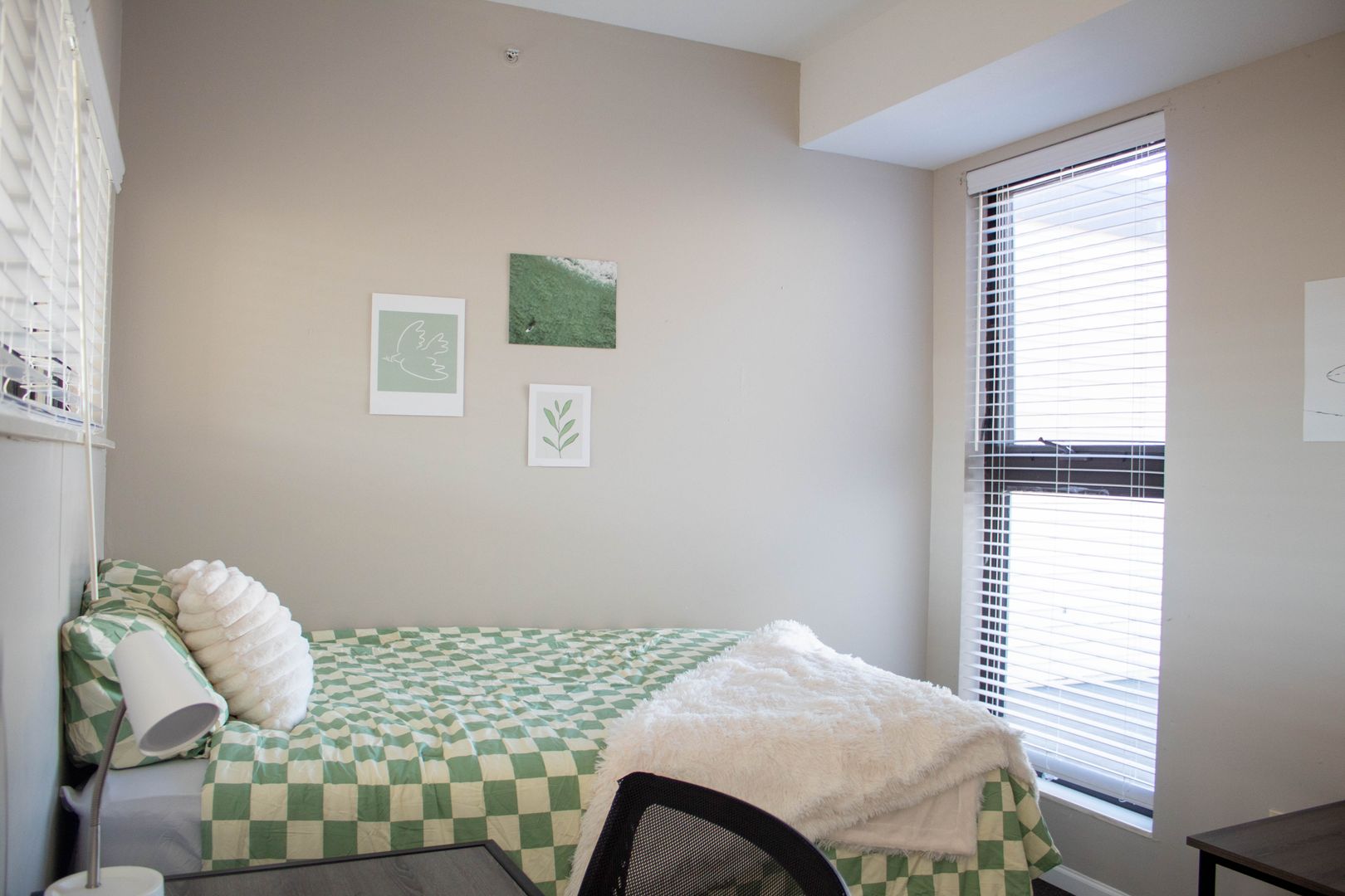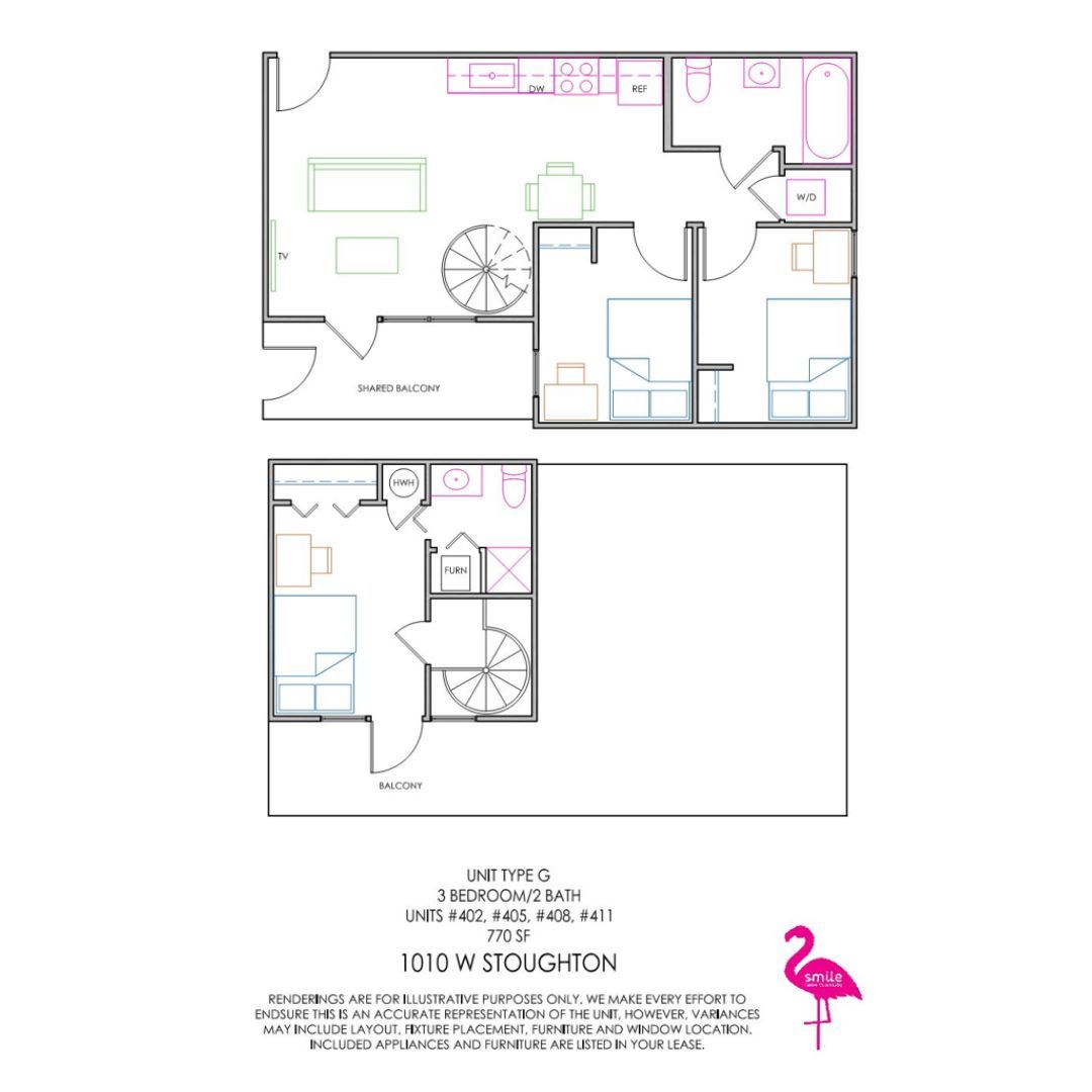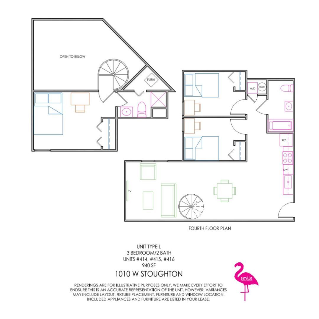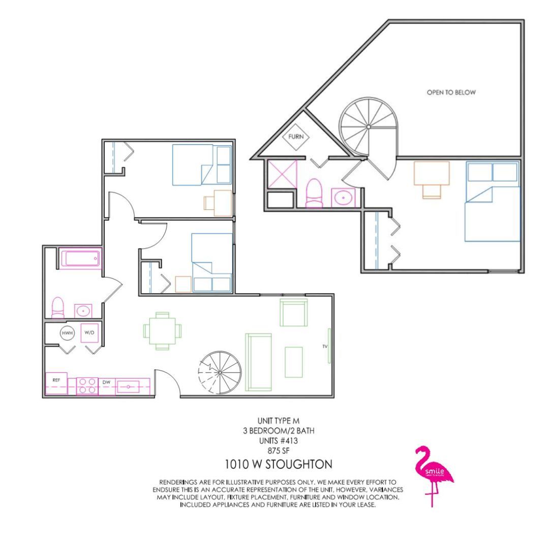 These upgraded lofted 3-bedroom, 1.5-bath apartments are just a few blocks from the UIUC Engineering campus in one of the greenest campus neighborhoods. Most units include access to a shared balcony, with dining options nearby on University Ave and Green St. All units feature in-unit laundry and a dishwasher.