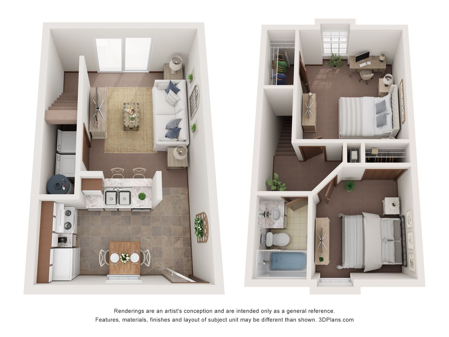 Experience comfortable living in our 850 sq. ft. 2-bedroom, 1-bath townhome, featuring a spacious floor plan, fully equipped kitchen, and in-unit washer and dryer.