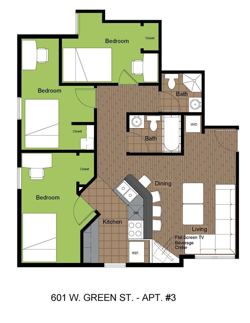 601 Green is located in a quiet neighborhood just blocks from the University of Illinois campus and Downtown Urbana. With bus stops steps away, you’ll have convenient access to transportation. This spacious apartment features high ceilings, two full baths, a large living and dining area, a built-in wet bar with a beverage chiller, a flat-screen TV, and in-unit laundry.
