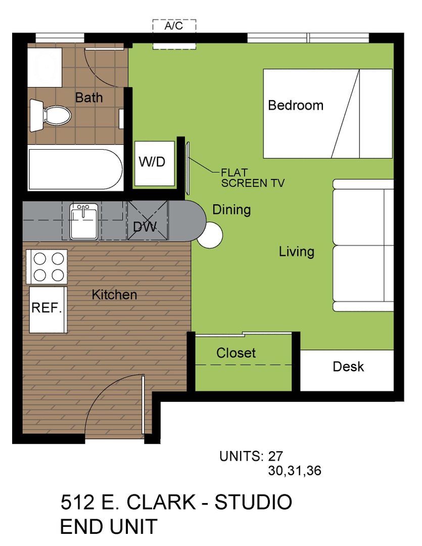 512 Clark features convenient studio apartments with a large living and dining area, flat-screen TV, dishwasher, and in-unit laundry. Located near shopping, restaurants, and the University of Illinois Engineering Quad, offering a comfortable and secure place to live and study.