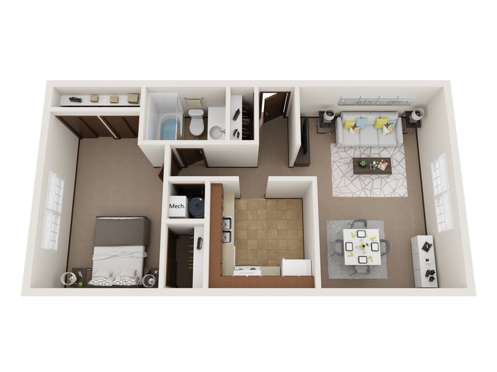 Explore our inviting 1-bedroom, 1-bathroom apartments located in Peoria, IL, offering a cozy 635 sq. ft. floor plan complete with appliances, including a fridge, oven range, and dishwasher. Each apartment features a comfortable living space and spacious walk-in closets.
