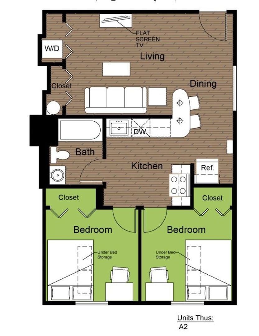 2 Bedroom 1 Bath Upper Floors: $679 (Full Unit $1,358)