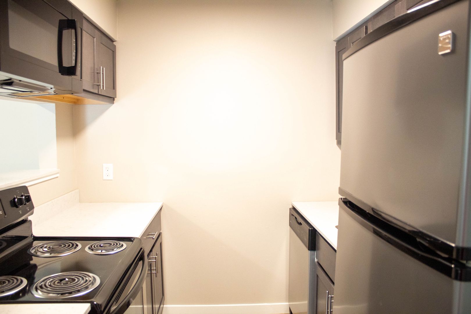 Remodeled units include in-unit laundry, vinyl plank flooring, brand-new kitchens with stainless steel appliances including a dishwasher, quartz countertops, new carpet, paint, and fixtures throughout.